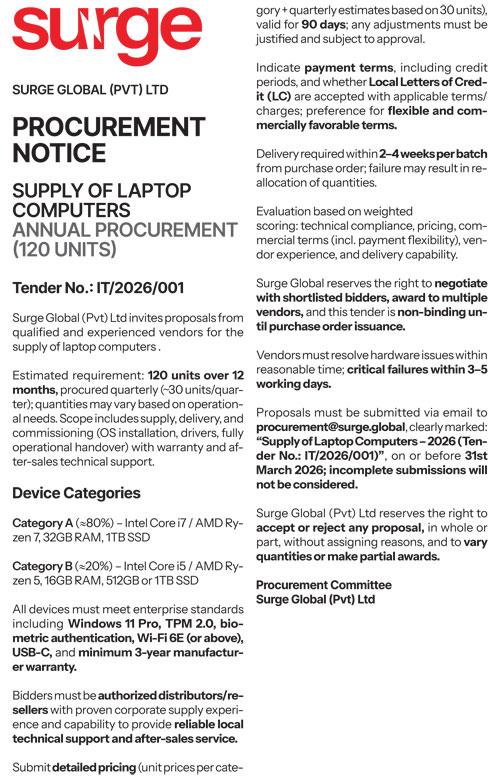 Surge Global (Pvt) Ltd invites proposals from qualified and experienced vendors for the supply of laptop computers. This procurement is structured as an annual framework agreement designed to support the organization’s operational and technological requirements.