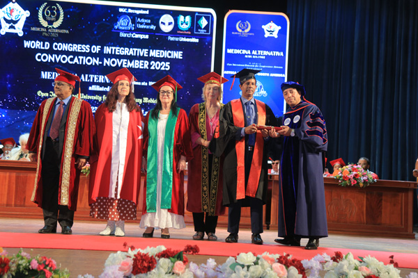 A proud moment at the 63rd World Congress of Integrative Medicine: Dr. Sir Don Buddika Sri Ranga Kumara Vittahachchi receives his Doctor of Philosophy (PhD) from Professor Dr. Ricardo Saavedra, Director & Chair of International Programs, Azteca University of North America, during the convocation ceremony organized by Medicina Alternativa on 26th November 2025.