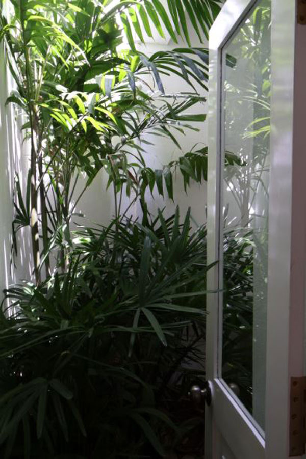 From the open plan living and dining areas, guests are led down a few steps into the sunken bedroom. The experience of descending into the bedroom gives the room a cool seclusion and the impression that the ceiling is soaring above the wide bed. As with the living and dining areas, the bedroom has its own courtyard garden. This tight control of space and vista is classic Bawa, and reminiscent of many of his properties, including his Lunuganga house and garden.