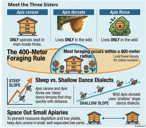 This secret language has major implications for Sri Lankan beekeepers, who currently see low honey yields of only 2–3 kg per hive. Because the domesticated Apis cerana is a short-range forager that rarely visits feeders beyond 500 meters, over-concentrating hives in one spot can be disastrous.