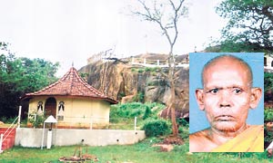 The Chamaragala in the background and (inset) Ven. Karavilagala Tissa Thera |