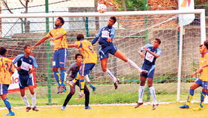 An Air Force player (Blue) flying to head the ball over Kalutara Park’s (yellow) defenders. |
