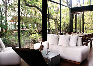 The furniture, aptly, is also of teak and upholstered with soft white furnishings. An outdoor seating space adjoining the lobby looks out on the lake, and the cool wind rushing through the rustling leaves makes this area calm and relaxing. Teak tables and chairs, accompanied by unpolished cut concrete block stools and benches are scattered through a replica of the lobby floor.
