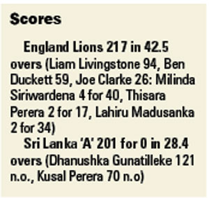 Sri Lanka ‘A’ openers Dhanushka Gunatilleke and Kusal Perera guided Sri Lanka ‘A’ in pursuit of 218 runs for victory to record an easy win by 119 runs on the Duckworth/Lewis method against England Lions in the second unofficial ODI encounter played at the Rangiri Dambulla Stadium yesterday.