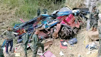Soldiers who rushed to rescue the victims are seen near the wreckage of the ill‑fated bus.