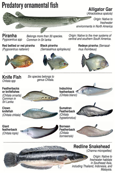 The Chairman of the authority, Kithsiri Dharmapriya, told the Sunday Times that there are three options for those who possess the four banned species: re-exporting them, both imported and locally bred; licensing and registering persons willing to keep banned fish species; and collecting unwanted fish by NAQDA.