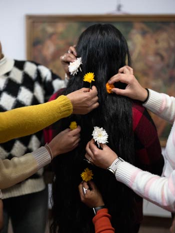 In My Left is Right (2022), KC critiques the stigmatization of the left hand in Hindu culture, challenging the validity of rituals performed by women or with the left hand. Her performance installation Chori Manche Bhayera … Keti Manche Bhayera … (2023), invites women to share their aspirations, disrupting restrictive gender roles imposed by phrases like “being a daughter, being a girl.”