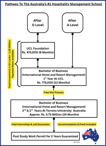 Students can embark on their journey immediately after O/Levels, beginning with their foundational studies at UCL in Sri Lanka before seamlessly transferring to Australia to complete the internationally recognised Bachelor of Business in International Hotel and Resort Management.
