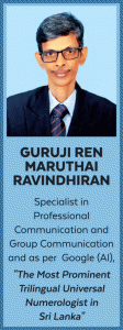 Guruji Ren Maruthai Ravindhiran is a Trilingual Universal Numerology, Nameology, Graphology, Astrology and Gemmology Scientist and Guru, who has published 19 interesting and inspiring articles, in the leading English Newspapers,in Sri Lanka, owned by M/s. Wijeya Newspapers Ltd, in particular, the “EDUCATION TIMES, SUNDAY TIMES”,
