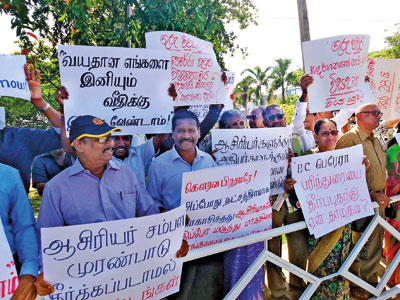 The National Organisation of Retired Teachers and Principals on Friday staged a protest in Chenkaladi, Batticaloa, demanding that the government resolves their pension discrepancies. Similar protests were earlier held in Colombo, Kandy, Gampaha, Galle and Kurunegala. (Pic by Padma Kumari Kankanamge)