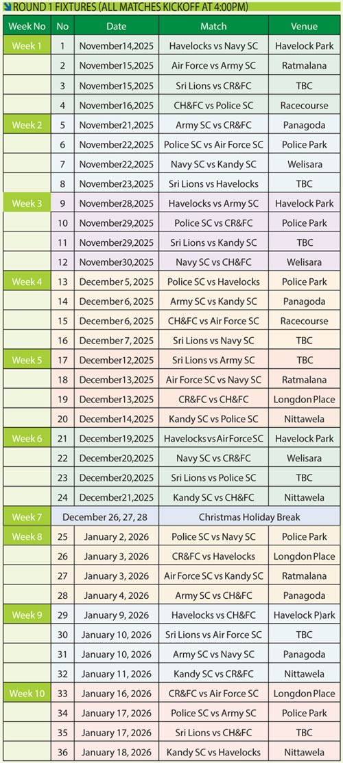 Following November 14, two games have been lined up for November 15, with Air Force SC taking on Army SC at Ratmalana, and Sri Lions hosting CR&FC. CH&FC will host Police SC at the Racecourse Ground on November 16.
