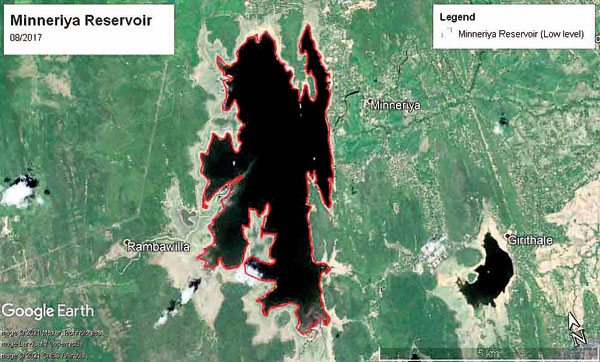 Aerial satellite images (1 & 2) of the Minneriya reservoir at a low level in 2017 with abundant grasslands (the red line depicting the water level and the lightly-shaded area adjacent, being the grasslands) and with full capacity in 2021 with not a blade of grass for the elephants