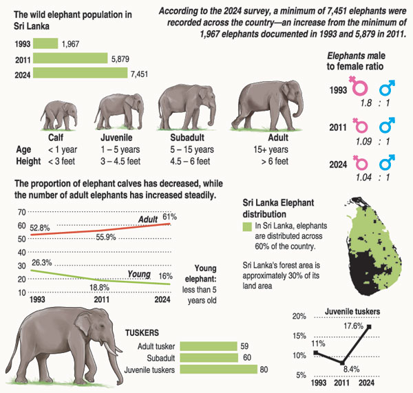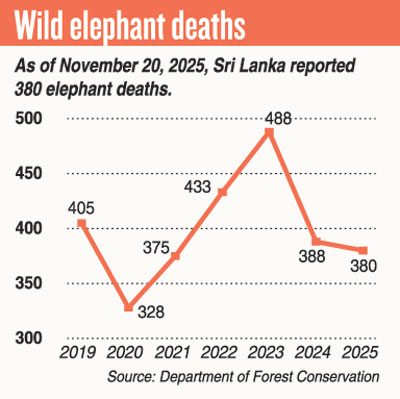 | Tally of deaths to surpass 2024 The Director General of the Department of Wildlife Conservation, Ranjan Marasinghe admitted the number of elephant deaths this year would surpass the 388 deaths in 2024. To date this year, 380 elephants have perished. He told the Sunday Times that according to the elephant survey in 2024 there are at least 7,451 wild elephants and the population is stable. Animals are ageing as there are more mature animals and fewer young animals. According to him, the conflict with elephants has intensified as male elephant numbers including juvenile tuskers have increased. | |