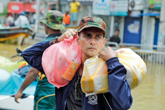 Wading through water with valuable provisions. Pic by Indika Handuwala