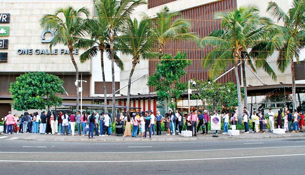 Come sun or rain, Sri Lankans love shopping – that is the middle and affluent classes! Others, unable to afford high prices, throng shopping malls, resorting to window-shopping (seeing-not-buying). The long line of shoppers outside the One Galle Face Mall in Colombo on Friday is a reflection of crowds at new malls which emerged this year. Pic by Indika Handuwala