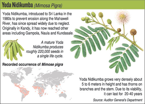 Environmental groups warn that the invasive plant known as ‘Yodha Nidikumba’ (Mimosa pigra), is rapidly engulfing the central region of the country.