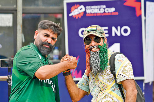 Cricket is not just a game; it is more than a passion in the South Asian subcontinent. The high-octane India-Pakistan clash in a packed stadium, electrified by fan emotions and patriotic fervor, makes every encounter between the two arch rivals unforgettable. The picture shows an Indian fan and a Pakistani fan making a friendship gesture near the Premadasa Stadium yesterday, ahead of today’s match — made possible also by Sri Lankan President Anura Kumara Dissanayake’s successful cricket diplomacy, which led Pakistan to reverse its decision to boycott the match. Pic by Eshan Fernando