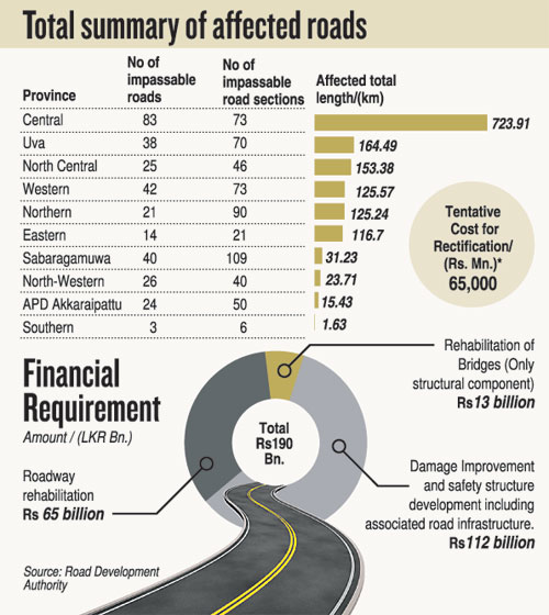 The Sunday Times learns that the total estimated cost for repairs is Rs. 190 billion. Of this, road rehabilitation accounts for Rs. 65bn, bridge reconstruction for Rs. 13bn, while the largest share, Rs. 112bn, is allocated for slope protection.