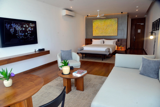 Anubava (meaning ‘Experience’) that stands sandwiched in between the two properties – has a delightful two-storeyed reception area with a medley of cosy armchairs and sofas and is also home to a lot of striking art including a giant Laki Senanayake owl, with a pickleball court on the rooftop and pool table and lounge.