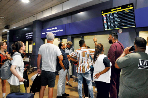 With US and Israeli missiles fired into Iran, and Iran directing missile attacks on Israel and US bases across West Asia, chaos reigned at Bandaranaike International Airport yesterday as flights to and from West Asian countries were cancelled or delayed, while airline officials struggled to find alternate arrangements and accommodations for stranded passengers. Pix by Nilan Maligaspe.