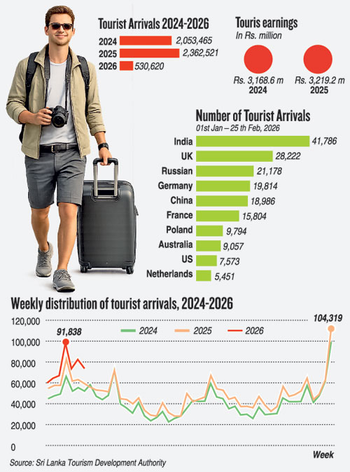 Sri Lanka’s tourism sector saw tourist arrivals rise in 2025, but average spending per tourist dropped, according to official data released by the Central Bank of Sri Lanka. This dilemma demands scrutiny of marketing strategies, strengthening regulatory mechanisms and introducing new products while ensuring sustainability, experts say.