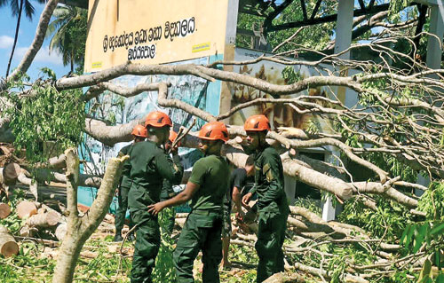 Strong winds in the past few days caused damage to a school in Wariyapola. Security forces are seen helping to clear the premises. Pic by Pushpa Weerakoon